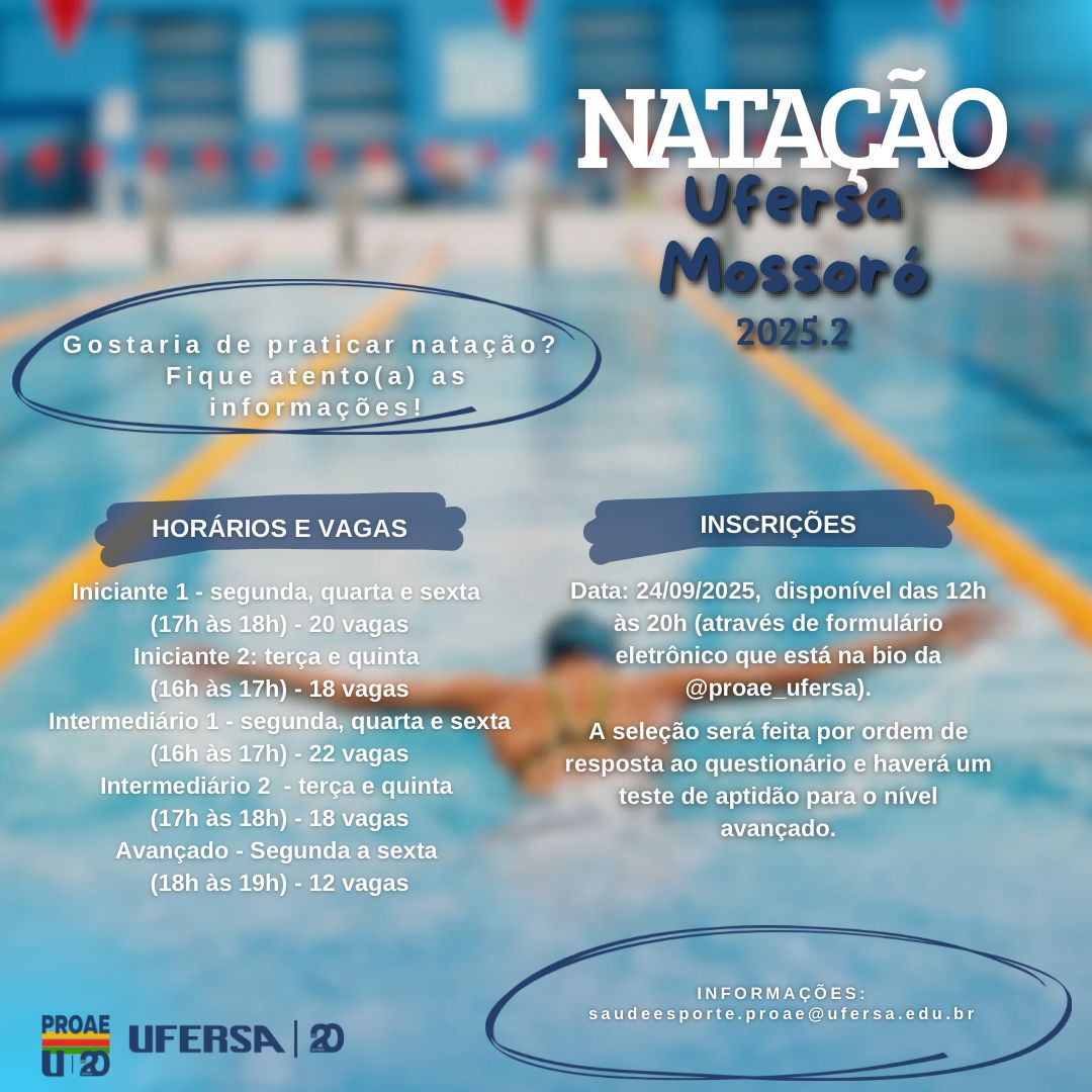 A Pró-Reitoria de Assuntos Estudantis abrirá inscrições para as turmas de natação destinadas aos discentes de graduação presencial da Ufersa/Campus Mossoró no dia 24/09/2025, através de formulário de inscrição, que será aberto no dia 24/09/2025, de 12h às 20h. A seleção será por ordem de inscrição no formulário.